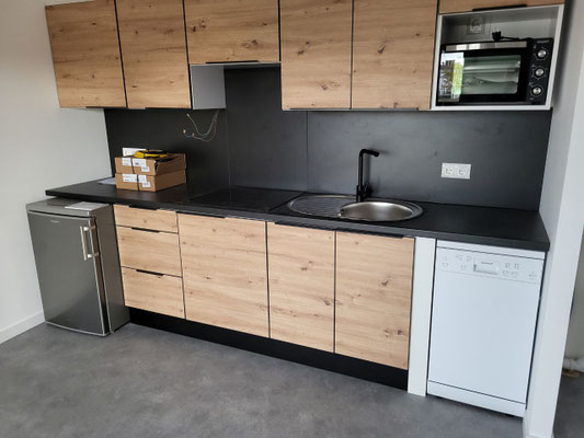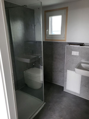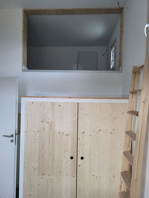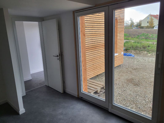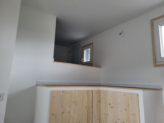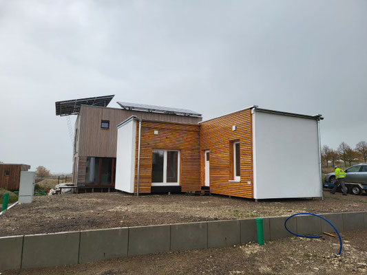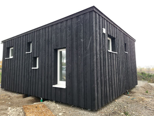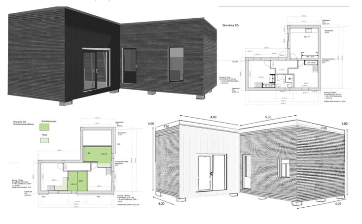 Hier wurden nur ökologische Baustoffe eingesetzt. Holzfenster sowie eine Holzfaserdämmung wurden verbaut. Zwei Seiten müssten als Gebäudeabschlusswände dargestellt werden. Die F90 Wände sind aus Brandschutz-Gründen mit einem Fassaden-Putz versehen worden. Klötzchen L52 hat zwei Zimmer mit jeweils einer Schlafempore. Eine große Küche sowie ein Duschbad finden im unteren Teil ihren Platz. Dieses Klötzchen bietet 3-4 Personen Platz.